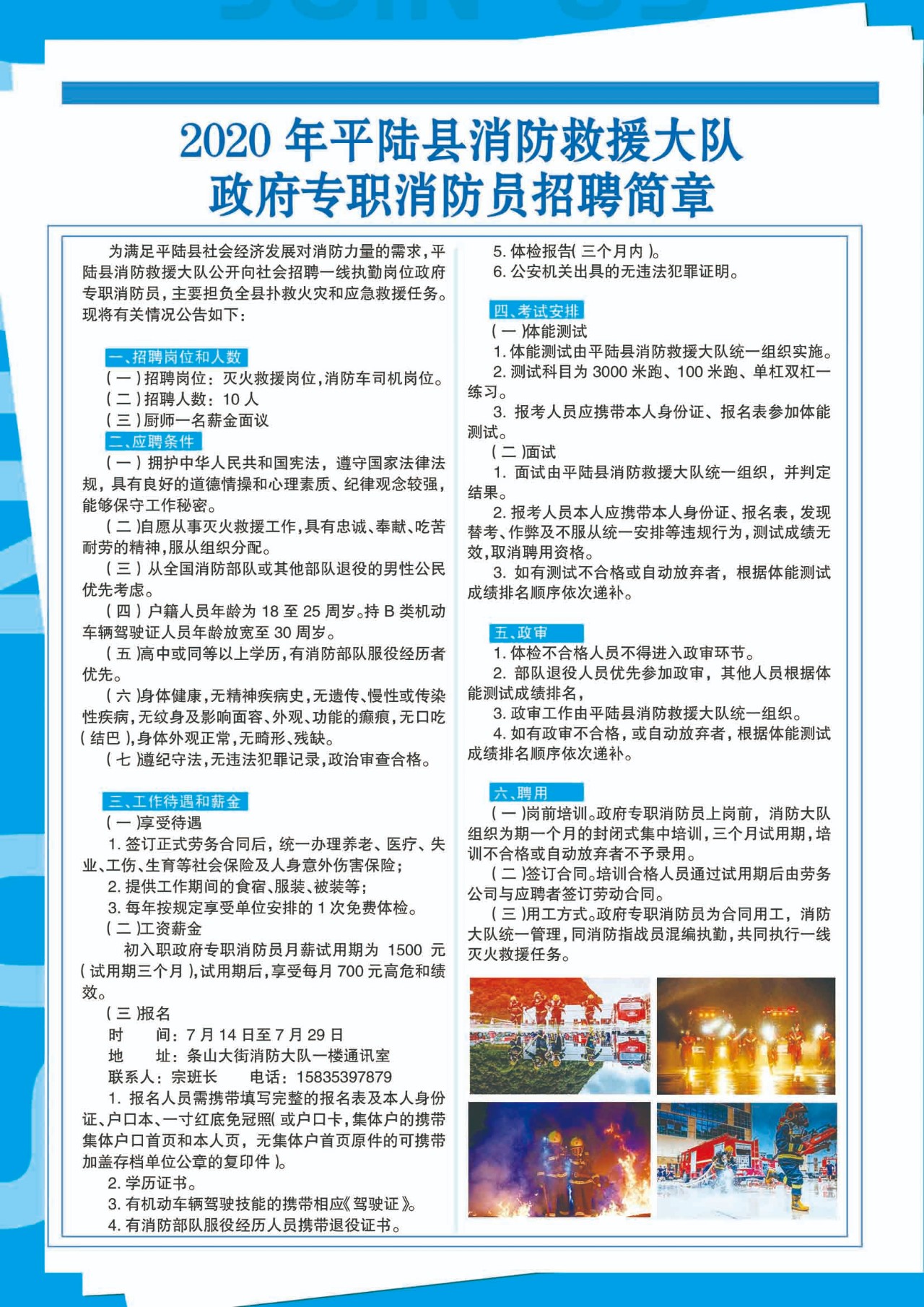 為滿足平陸縣社會經濟發展對消防力量的需求,平陸縣消防大隊公開向社會招聘一線執勤崗位政府專職消防員,主要擔負全縣撲救火災和應急救援任務。現將有關情況公告如下:
