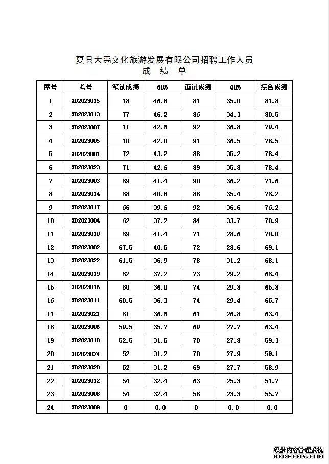 一、夏縣大禹文化旅游發(fā)展有限公司考試已如期進(jìn)行,現(xiàn)成績公示如下: