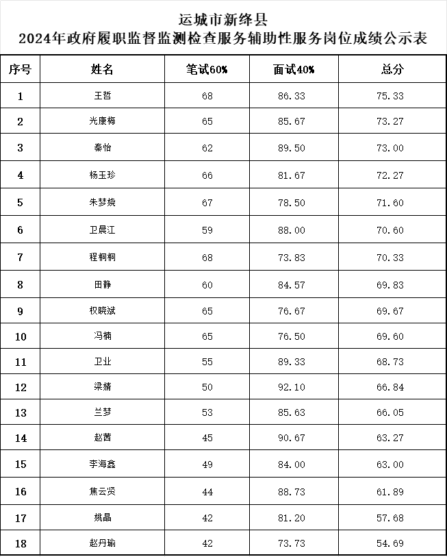 運(yùn)城市2024年政府履職監(jiān)督監(jiān)測(cè)檢查輔助性服務(wù)崗位考試已如期進(jìn)行,現(xiàn)成績(jī)公示如下: