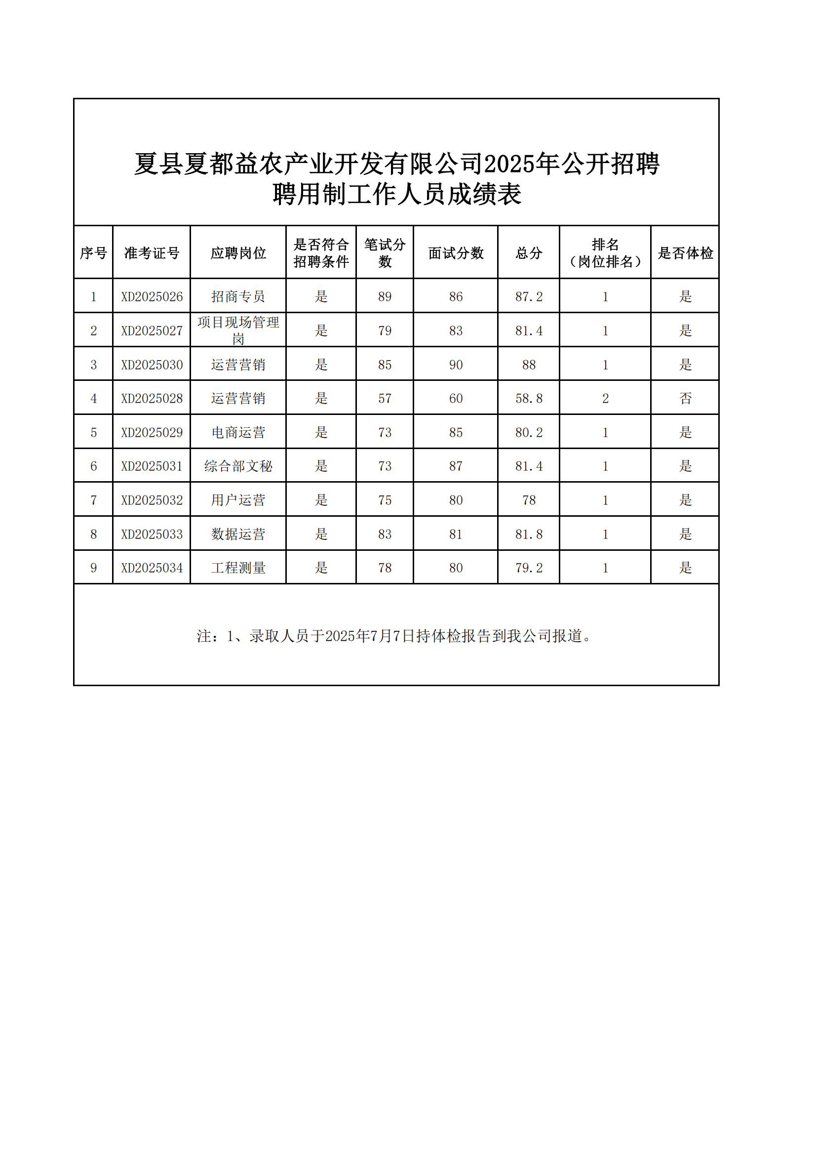 夏縣夏都益農產業開發有限公司有限公司2025年公開招聘考試已如期進行,現成績公示如下: