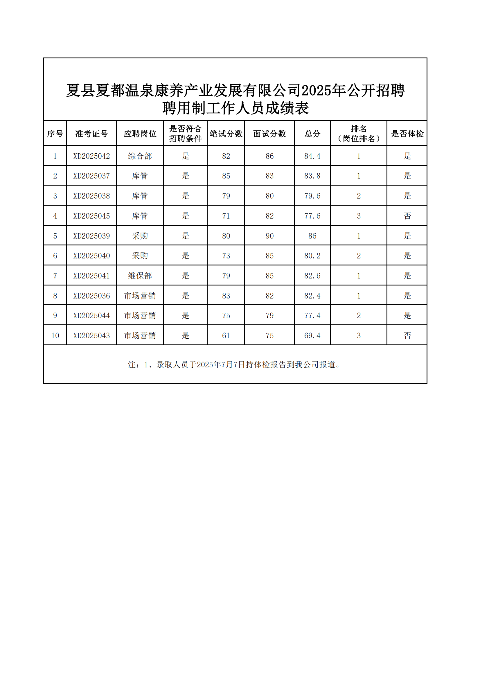 【成績公示】夏縣夏都溫泉康養產業發展有限公司